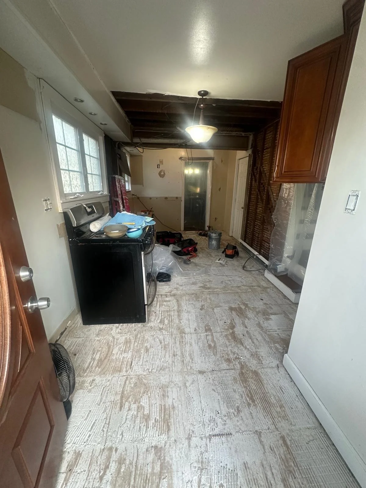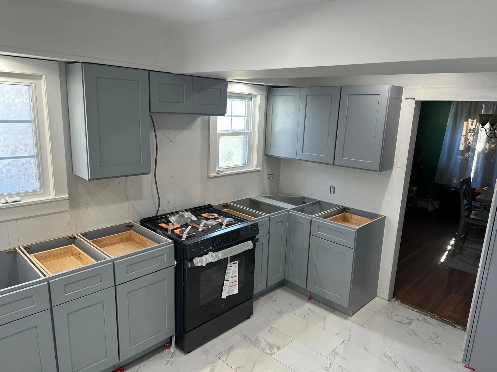 Bathroom Remodel Kitchen renovation. Tiling process Kitchen Cabinets installation 3 story building interior renovation